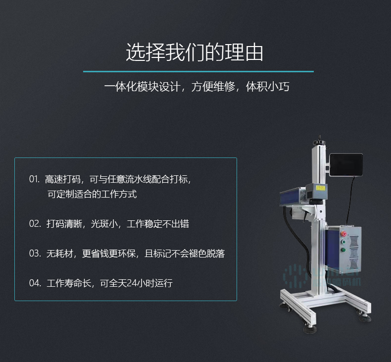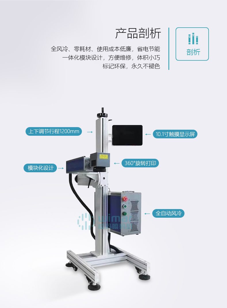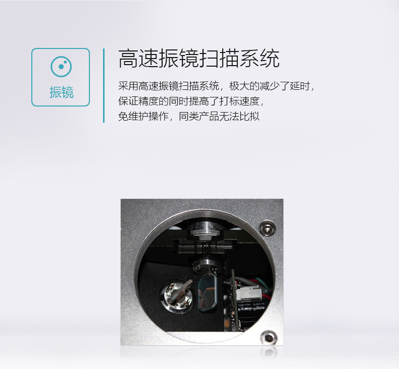 采用光纖激光器輸出激光,電光轉(zhuǎn)換率高,體積小巧,不需外部水冷卻設(shè)備,光束質(zhì)量好。光纖激光器先進(jìn)的固體激光器,使用壽命長,維護(hù)費(fèi)用低。觸摸飛行打標(biāo)系統(tǒng),操作方便,穩(wěn)定性高,運(yùn)行速度快,現(xiàn)行的3.0版系統(tǒng),是全球飛行打標(biāo)速度較快的系統(tǒng)之一。